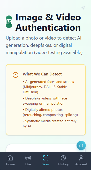 20 scans per monthper additional scanImage & video analysisAI generation detectionDeepfake detectionAnalysis history